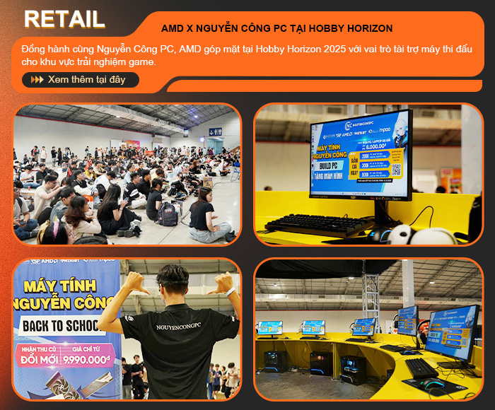 Song song đó, tại thị trường Việt Nam, AMD tiếp tục hiện diện mạnh mẽ trong cộng đồng công nghệ. Sự kiện Hobby Horizon 2025 ghi dấu sự hợp tác giữa AMD và Nguyễn Công PC, tài trợ dàn máy thi đấu cao cấp, góp phần mang đến trải nghiệm gaming đỉnh cao cho người tham dự.