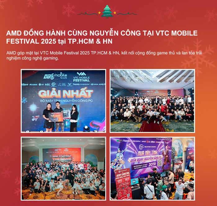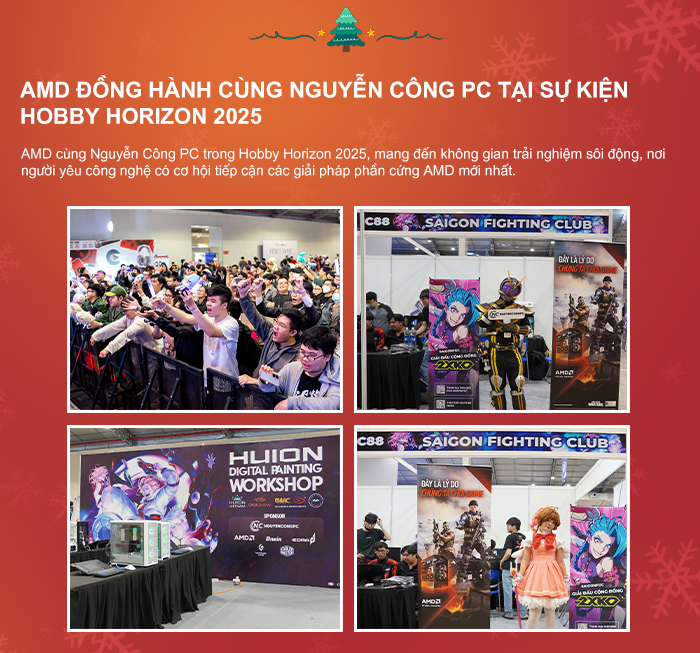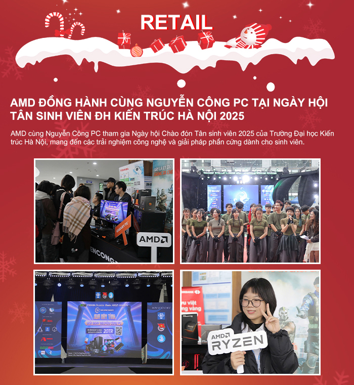 Song song đó, AMD tiếp tục đẩy mạnh hoạt động cộng đồng và hợp tác đối tác. Trong tháng, AMD đã đồng hành cùng Nguyễn Công PC tại Ngày hội Chào đón Tân sinh viên ĐH Kiến trúc Hà Nội, tham gia Hobby Horizon, và góp mặt tại VTC Mobile Festival, mang công nghệ AMD đến gần hơn với sinh viên, game thủ và người yêu công nghệ.
